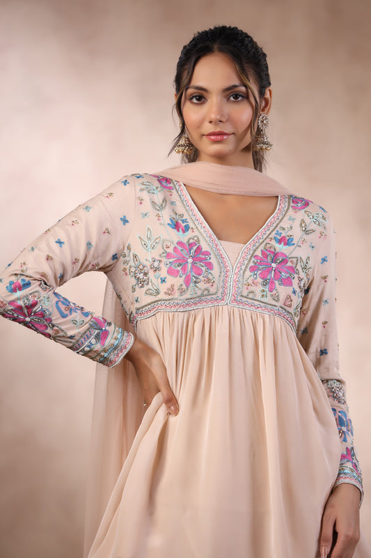 Pink Blossom: Cotton Suit Set with Thread Embroidery